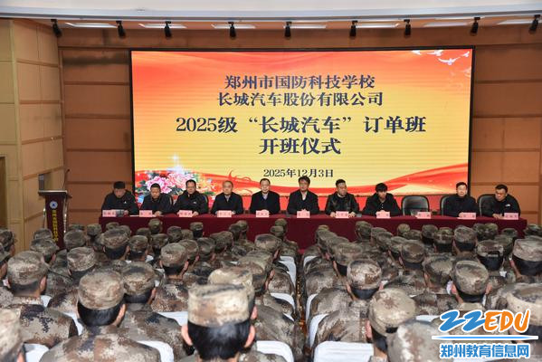 为深化产教融合、校企合作,精准对接企业人才需求,培养高素质技术技能人才,12月3日下午,由郑州市国防科技学校与长城汽车股份有限公司(简称:长城汽车)共同举办的2025级“长城汽车”订单班开班仪式在郑州市国防科技学校报告厅举行。